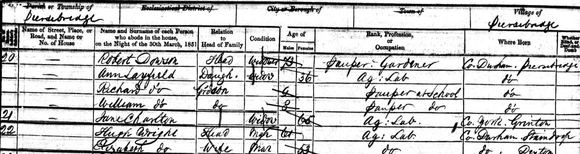 Notice that not only does the head of the house share the same name, he is easily old enough to be Hugh’s father (and Thomas’s grandfather) and is married to an Ann Wright. Thomas and Ann are the names of Hugh’s twins AND they live next door in a small place like Piercebridge…. surely this is NOT a coincidence. Next door to this older Thomas lives a licensed victualler (of an Inn), then a postmistress, a butcher and a saddler so it seems they were living very close to some shops. I can’t find a spinster called Mary Wright on the 1851 census if indeed she was a spinster in 1841, she may have been visiting her parents on the night of the 1841 census of course and the census taker simply put her down as a Wright and you can see he had started writing Wr…