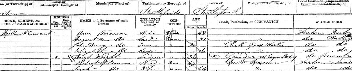 I have found a Hugh Wright aged 36 born in Piercebridge. He is working as a Cutter/Grinder in an engineering factory and living as a Lodger in Hartlepool with a family called Anderson. Perhaps he is a relative, Hugh Wright isn’t that common a name in a small place like Piercebridge. That would make him being born in 1835. Our Hugh has a son Hugh born c1831 in the 1841 census which is so close to make it tantalising. If you look back at the 1841 census you will see that all their ages have been rounded to the nearest 5 years. In a small place like Piercebridge in 1841 what is the chance of there being THREE Hugh Wrights and two of them very close in age?